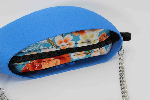 3D printed bag, made with eco-friendly materials, PLA, available in different color variations and matt or metallic or striped finishes. Internal bag closed by zip.