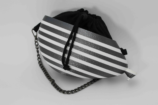 Borsa stampata in 3D , realizzata con materiali eco-friendly, PLA, disponibile in diverse varianti di colore e finiture opache o metallizzate o a righe. Sacca interna chiusa da zip.