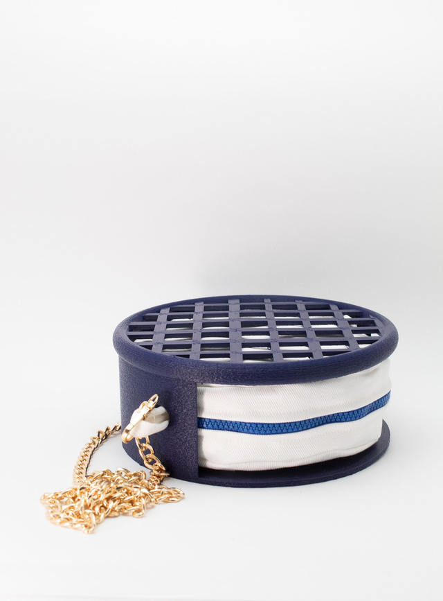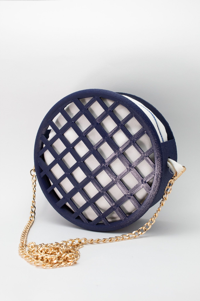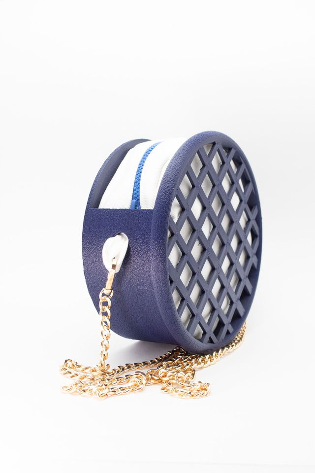 3D printed bag, made with eco-friendly materials, PLA, available in different color variations and matt or metallic or striped finishes. Internal bag closed by zip.