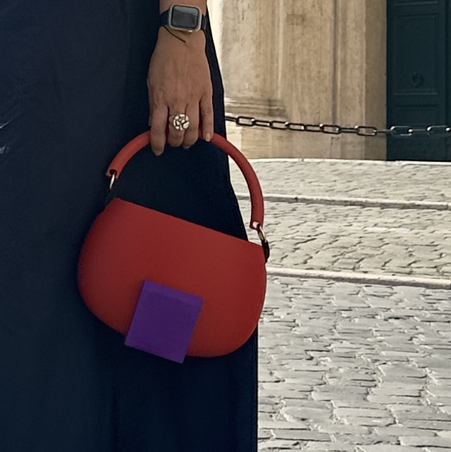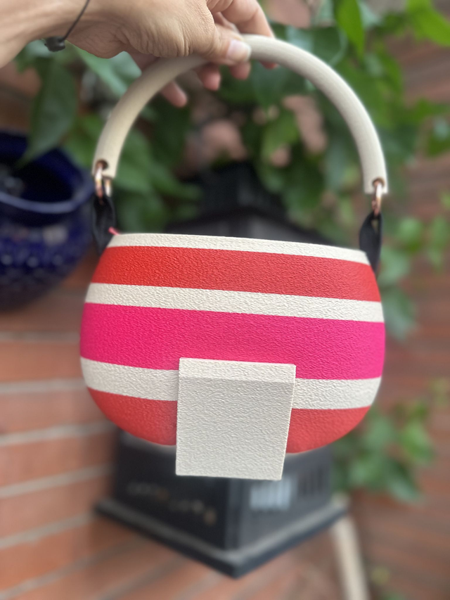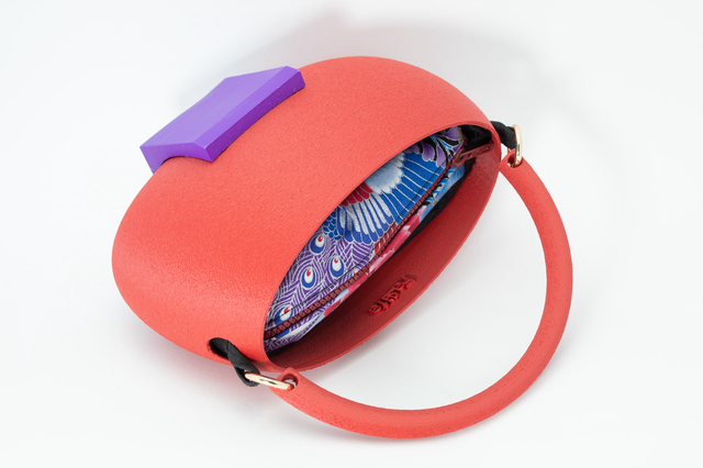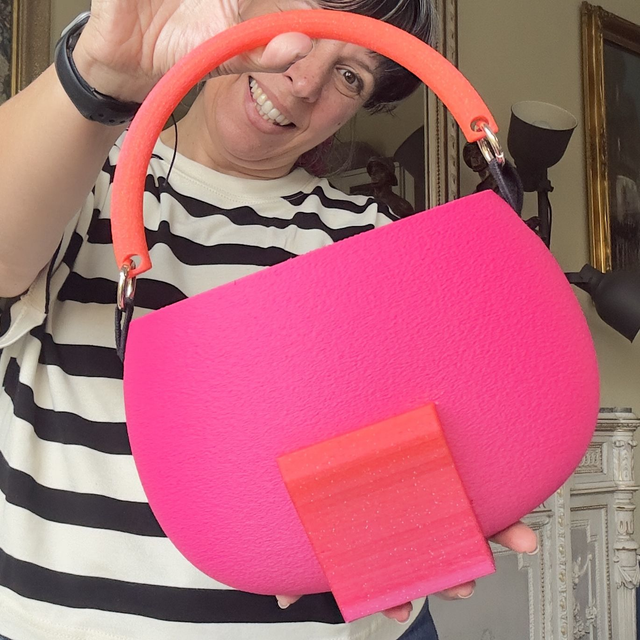 3D printed bag, made with eco-friendly materials, PLA, available in different color variations and matt or metallic or striped finishes. Internal bag closed by zip.