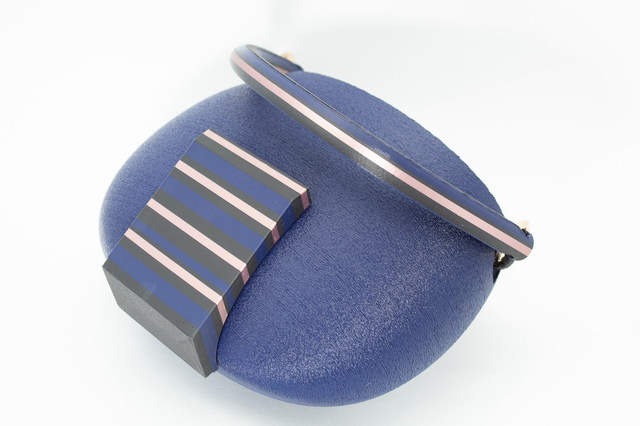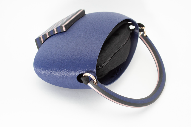 3D printed bag, made with eco-friendly materials, PLA, available in different color variations and matt or metallic or striped finishes. Internal bag closed by zip.