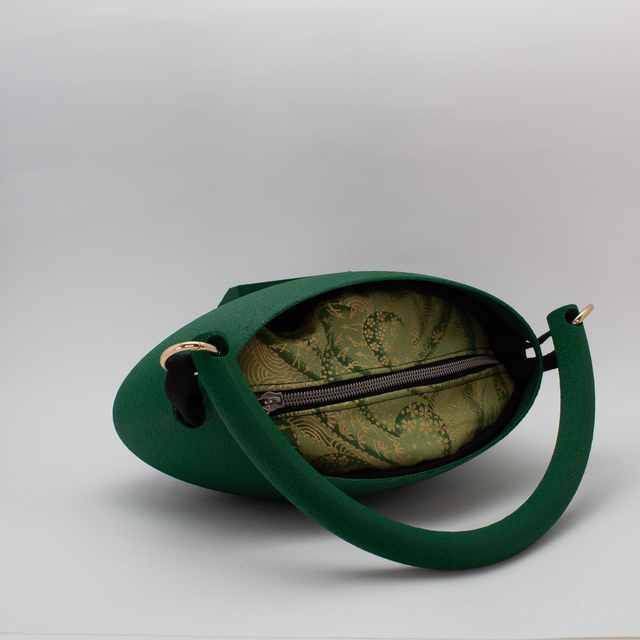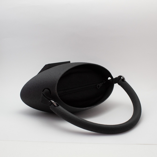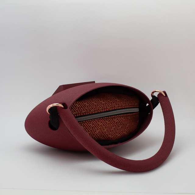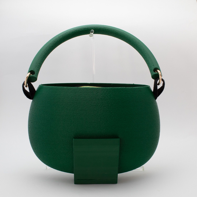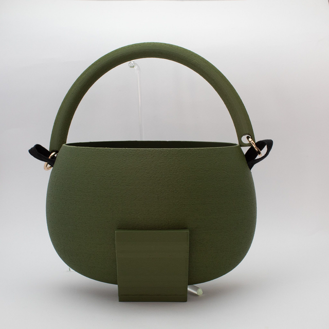 3D printed bag, made with eco-friendly materials, PLA, available in different color variations and matt or metallic or striped finishes. Internal bag closed by zip.